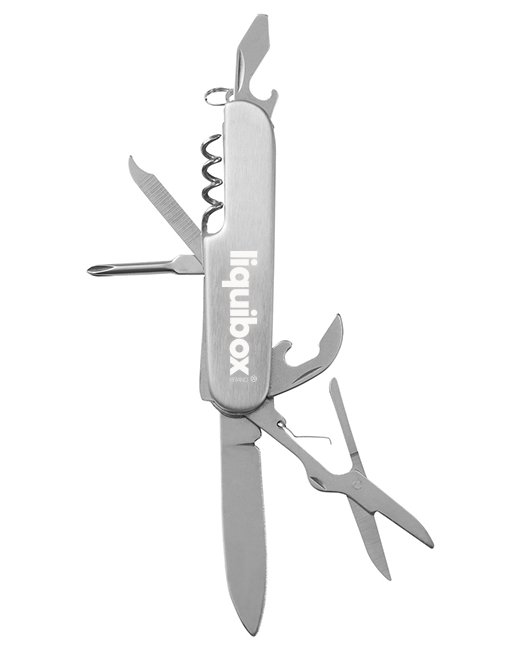 - 8 functions include a knife, nail file, scissors, can opener, bottle opener, flat head, Phillips screwdriver and corkscrew